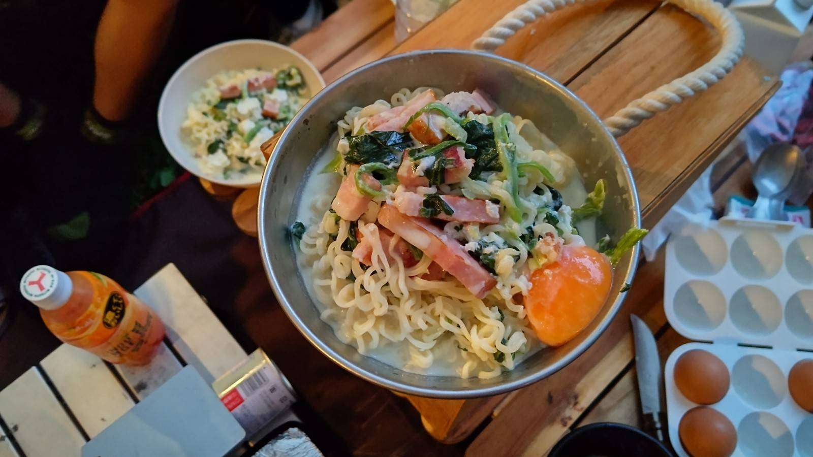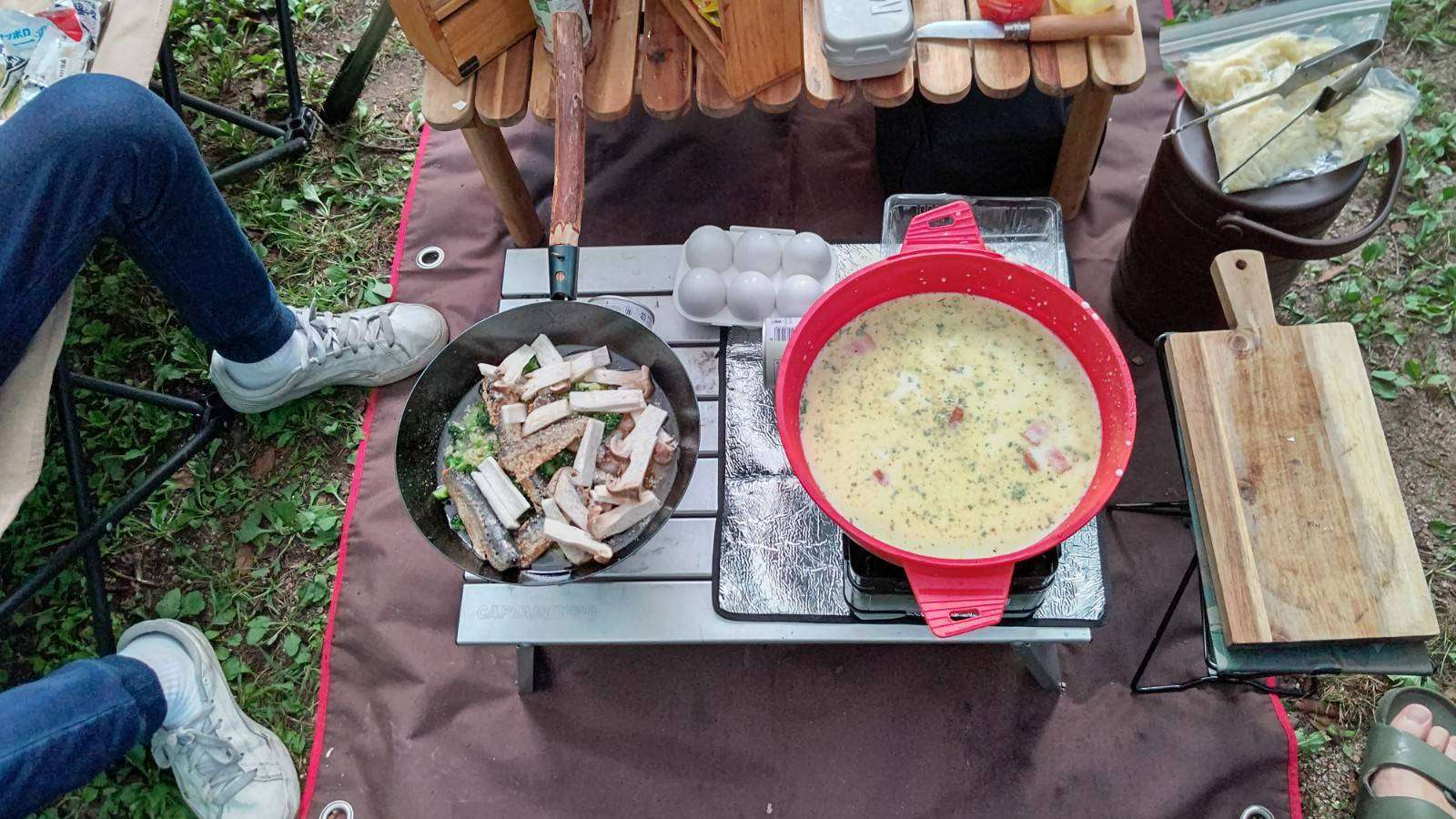 外でのご飯というと皆さん夏はバーベキューなイメージだと思いますが、Mは炭に火が付くのを待ってられないタイプですので普段家では作らない料理をやったりしています。