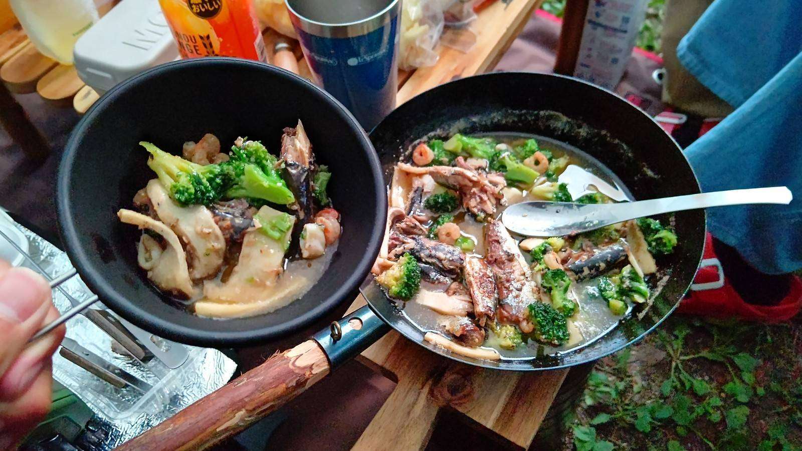 こんな感じでコンロを2つ並べて調理していき、材料をぶち込むだけで出来る料理を楽しんでます。
