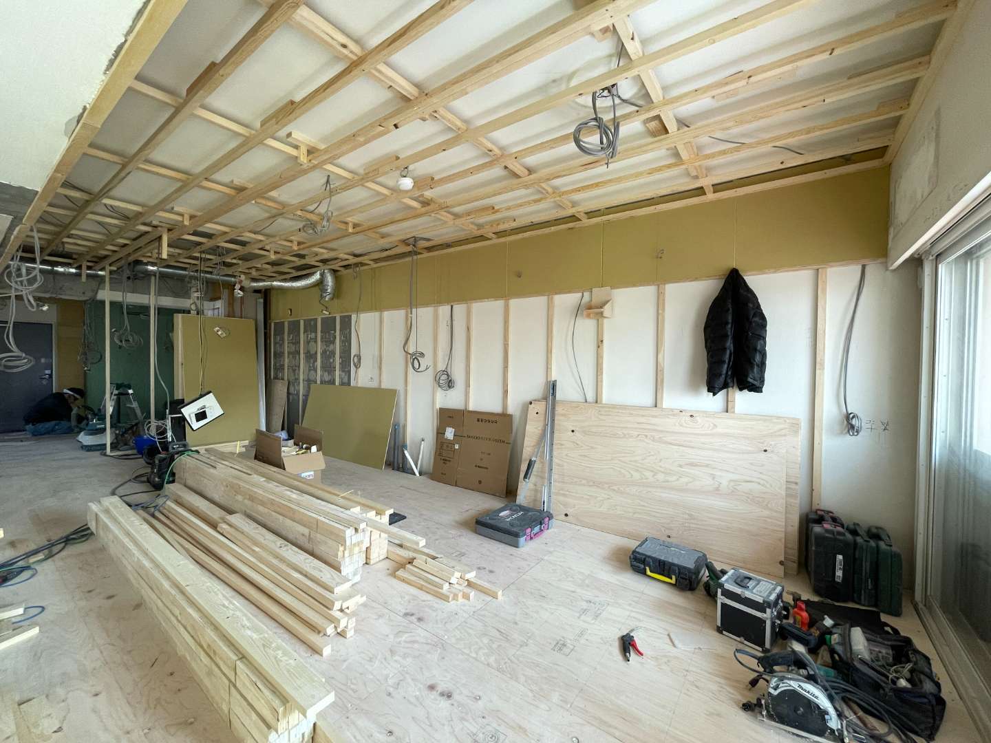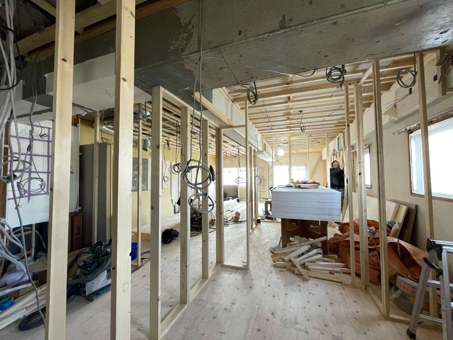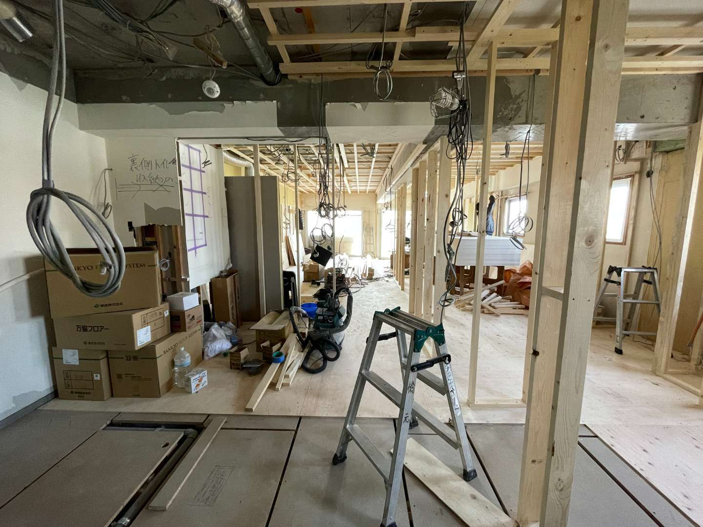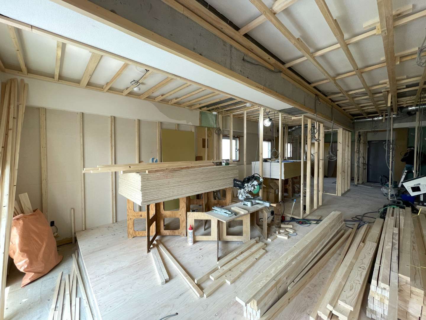 床の下地が出来上がり間仕切りの壁用の下地や天井の下地が出来上がっていっております。