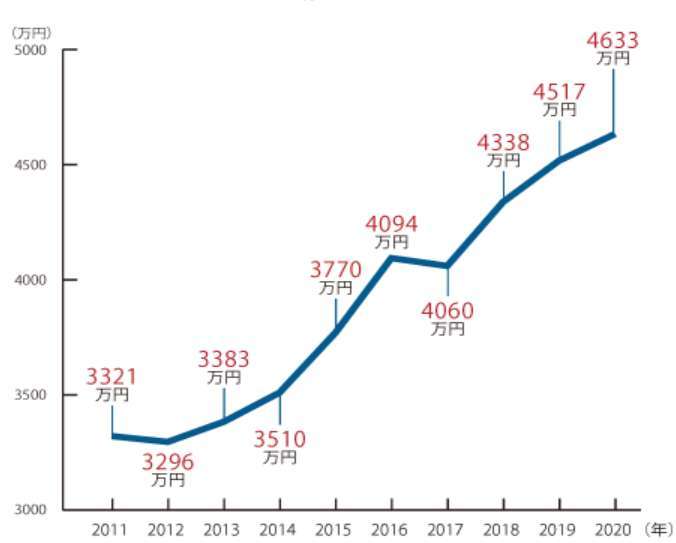 全購入者の平均価格がグラフになり2020年の段階で4,633万円とここ10年で右肩上がりとなっております。