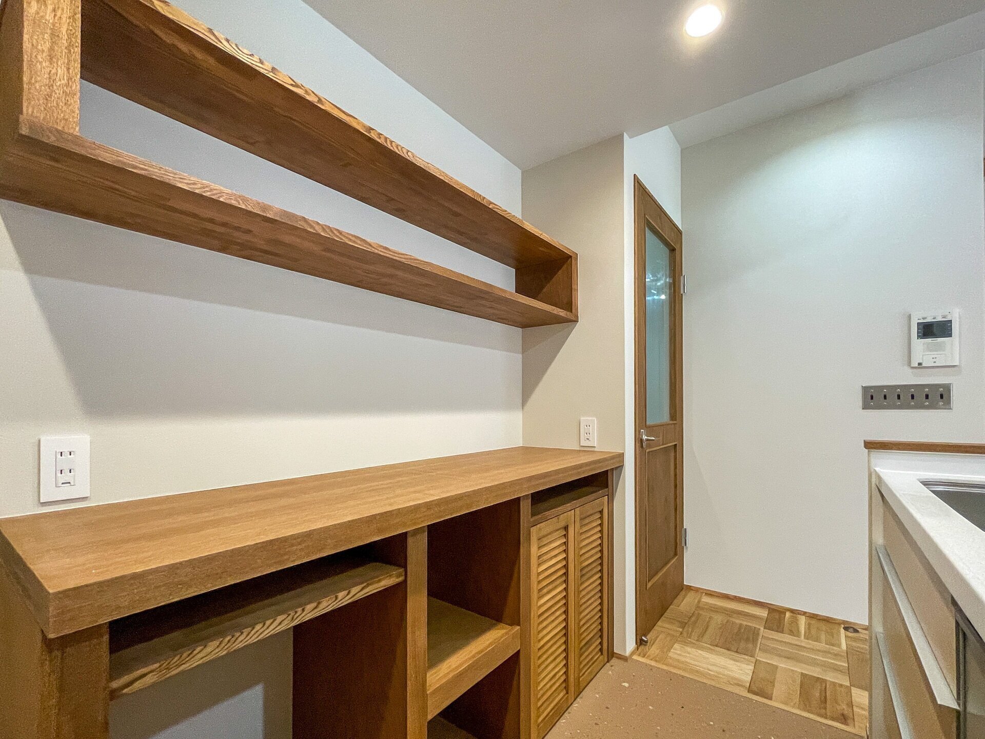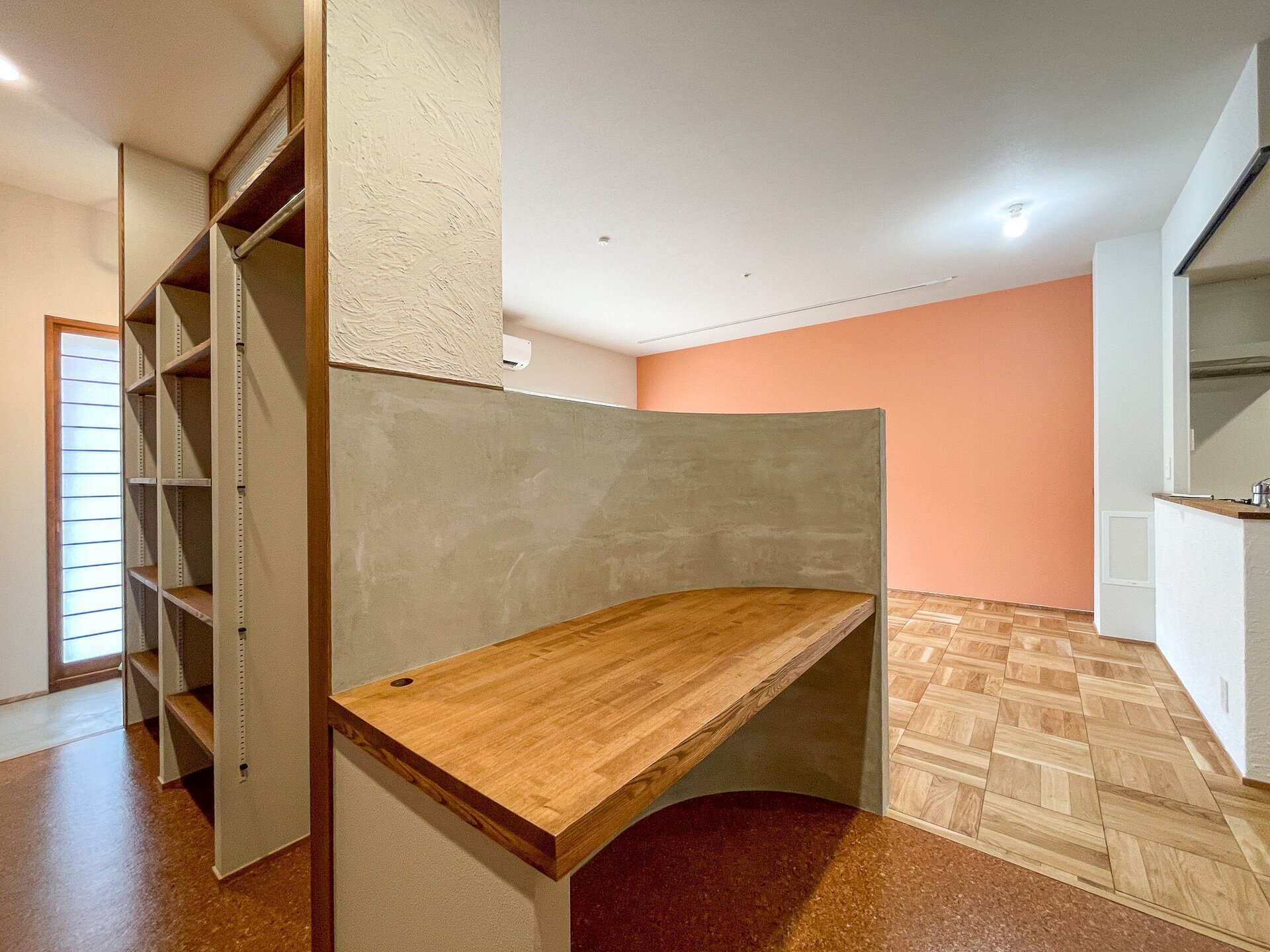 リズミカルな市松貼りの床とグッと印象を惹きつけるサーモンピンクの壁。一歩足を踏み入れると、玄関からそのまま開放的なLDKが広がります。最大限のスペースを割いたリビングは、木の温かみが全面に感じられる無垢の床。個性が引き立つ市松模様の床はどこか懐かしい雰囲気を放っています。真っ白な壁と天井が床の個性を引き立たせました。サーモンピンクの壁と漆喰壁はお友達を呼んでワイワイ塗りパーティーで塗ったもの。既存の設備を使いつつ、こだわるところはしっかりと造作で。愛され上手な施主さまご夫婦のポップなイメージにぴったりなお部屋が完成しました。