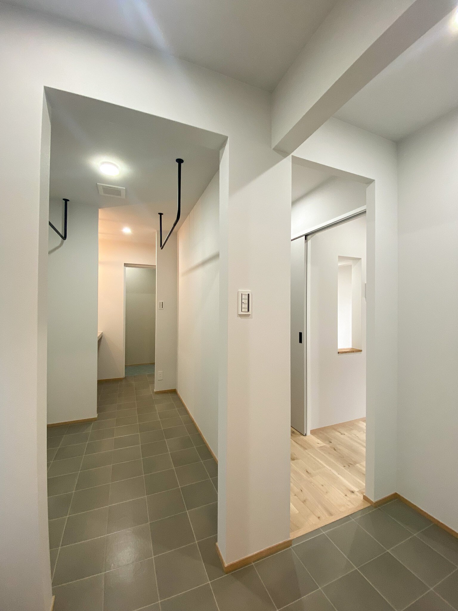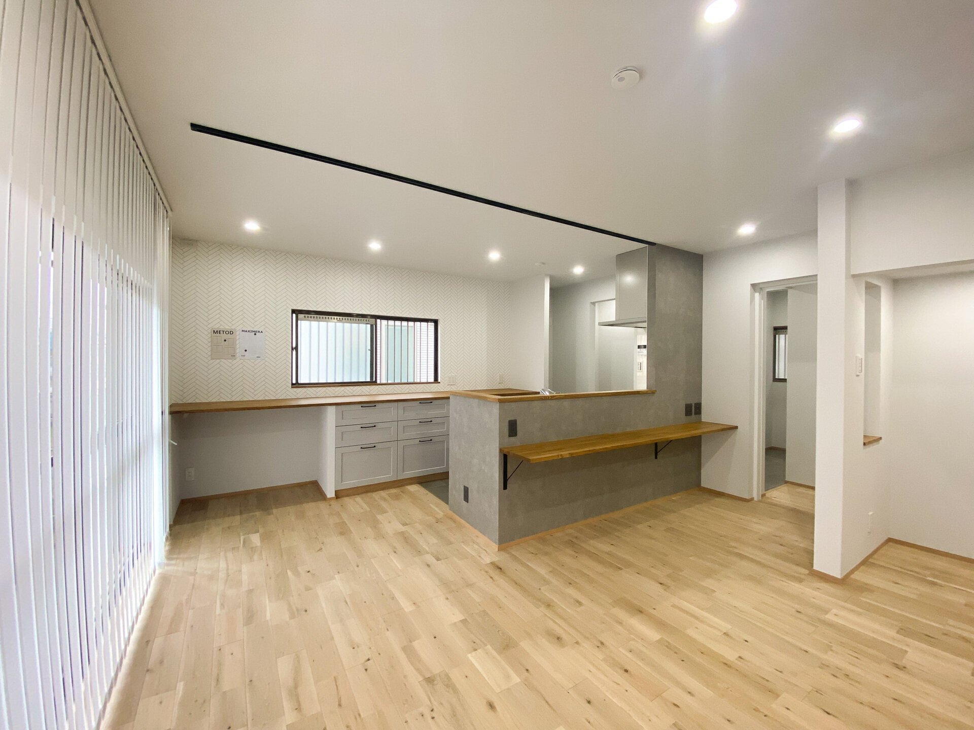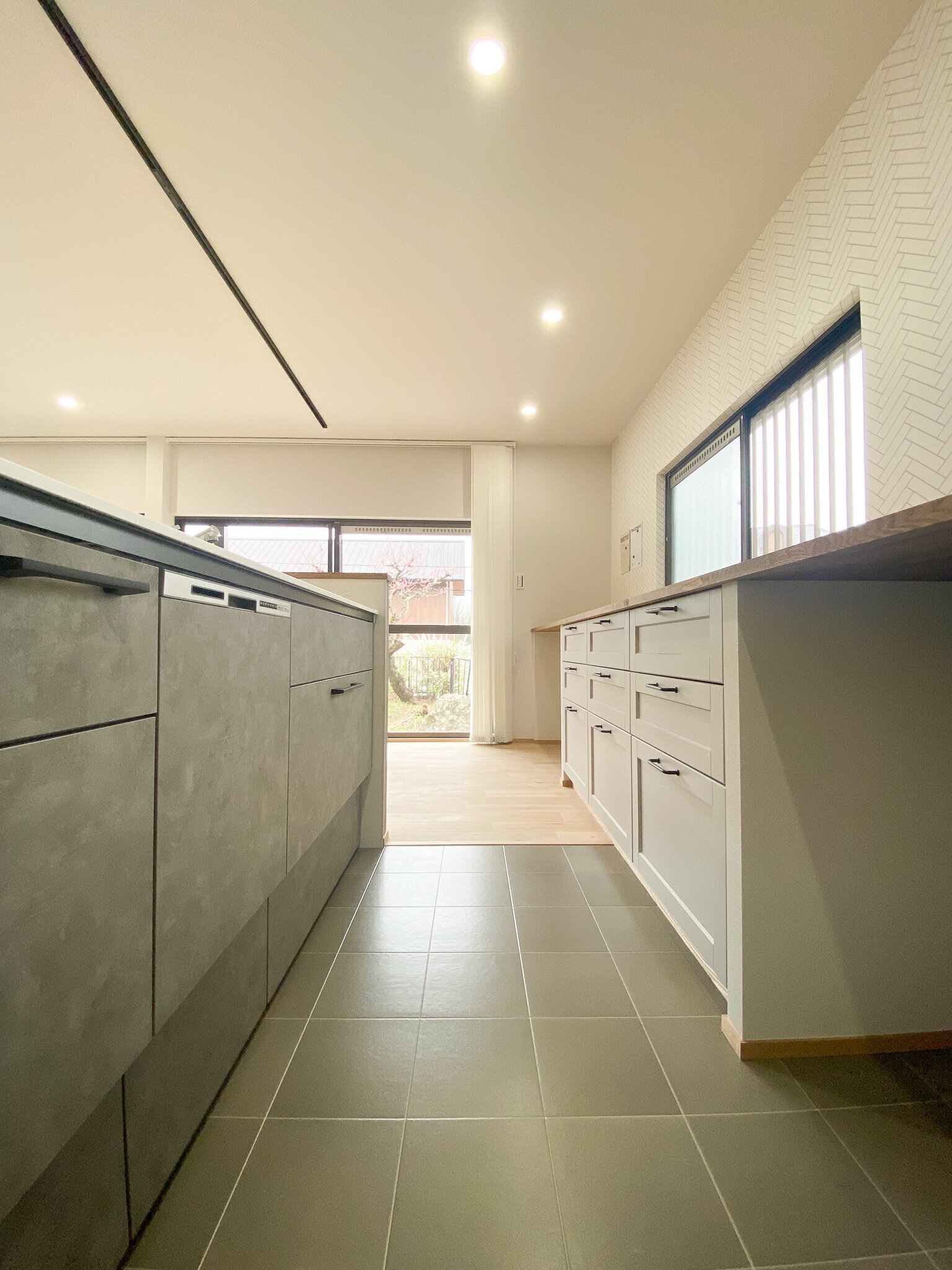 全体的にグレーカラーでまとめられ、その色を中心にアクセントなどで楽しみつつもこだわりカラーでまとめました。大容量のパントリーやユーティリティも併設し天井からの縦型ブラインドやハイドアにすることでよりすっきりとした広がりのある空間へ。キッチンの背面壁紙はモノトーンのヘリンボーンでアクセント。階段下はお子様の秘密基地に生まれ変わりました。どこを切り取ってもシックな景色が見えるお住まいになりました。
