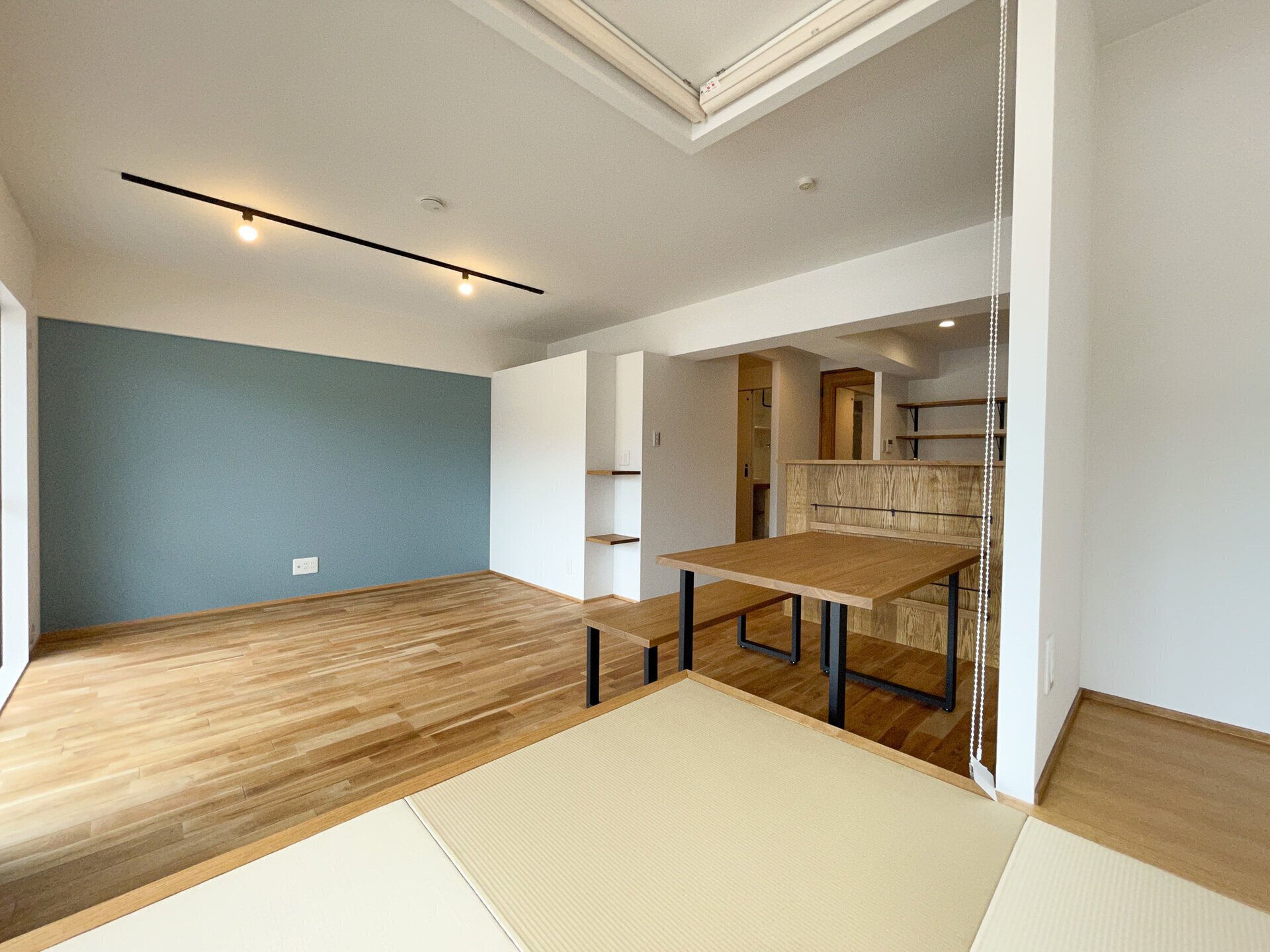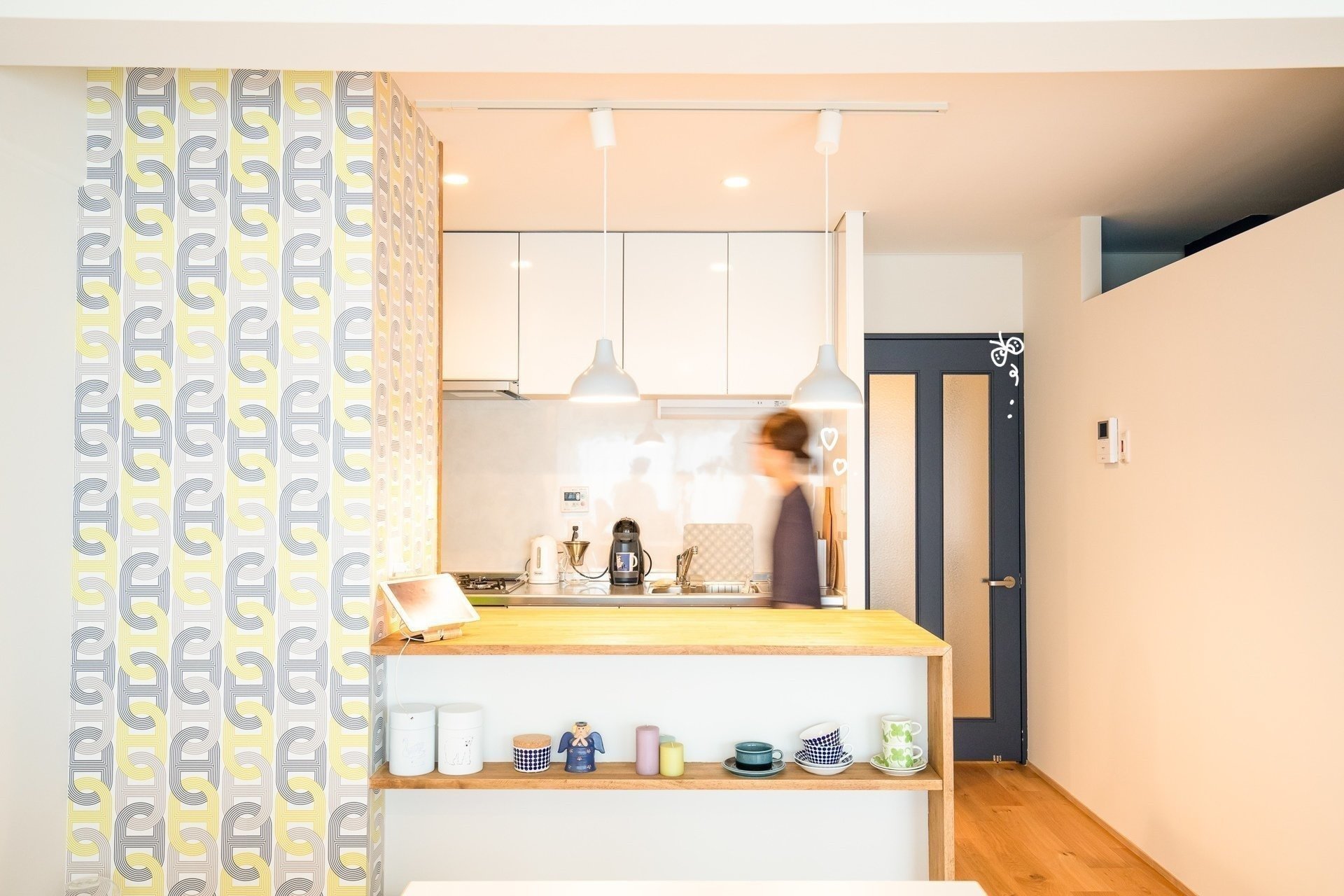 床には無垢風の突板フローリング材を採用し優しい空間に。リノベーション前にあったLDKの仕切りとなっていた和室。これを取っ払い、広く採光が取れてかつ風通しの良い空間に生まれ変わりました。まさに、ひだまりに包まれた、チャーミングな家。