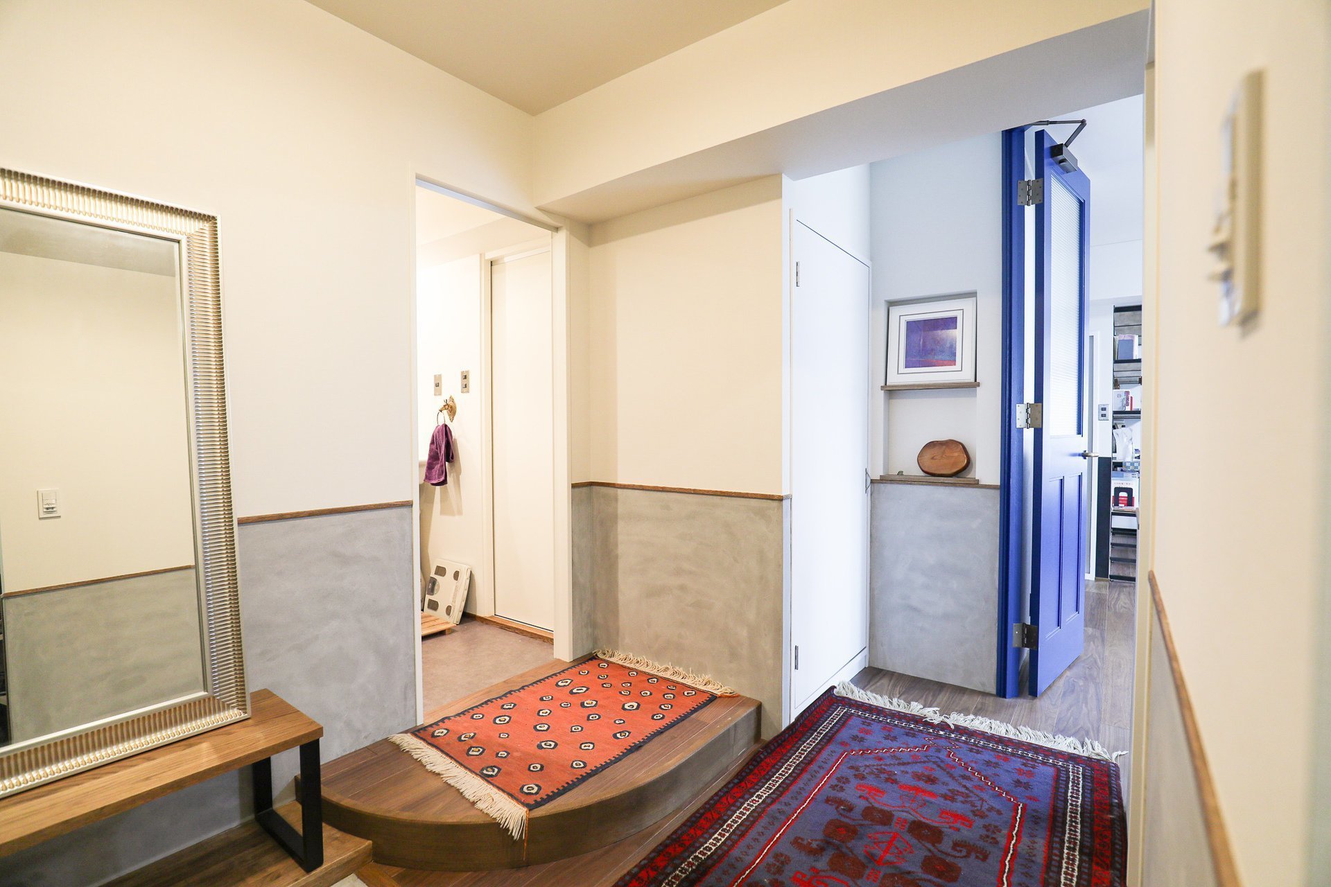 またご予算に合わせてキッチンは既存のままに浴室を入れ替え、オリジナルアイアンで作ったリビング造作家具を設置。アンティークモダンなヴィンテージテイストを感じる空間に。さらにLDKにあわせて玄関もテイストを合わせてリノベーション。