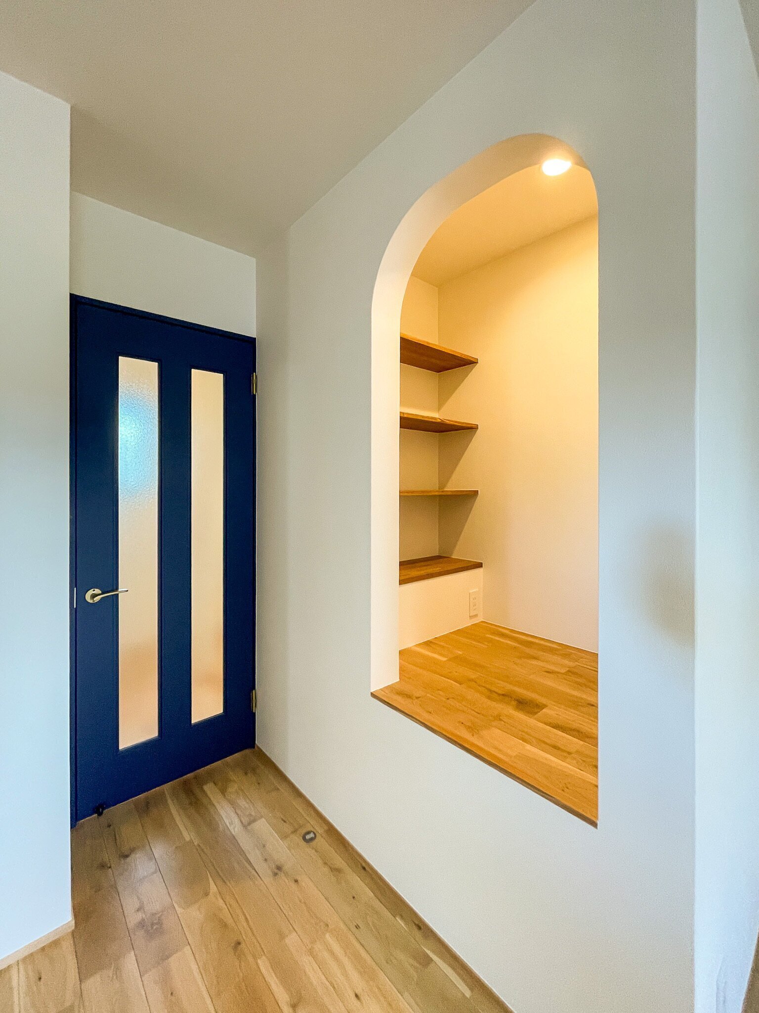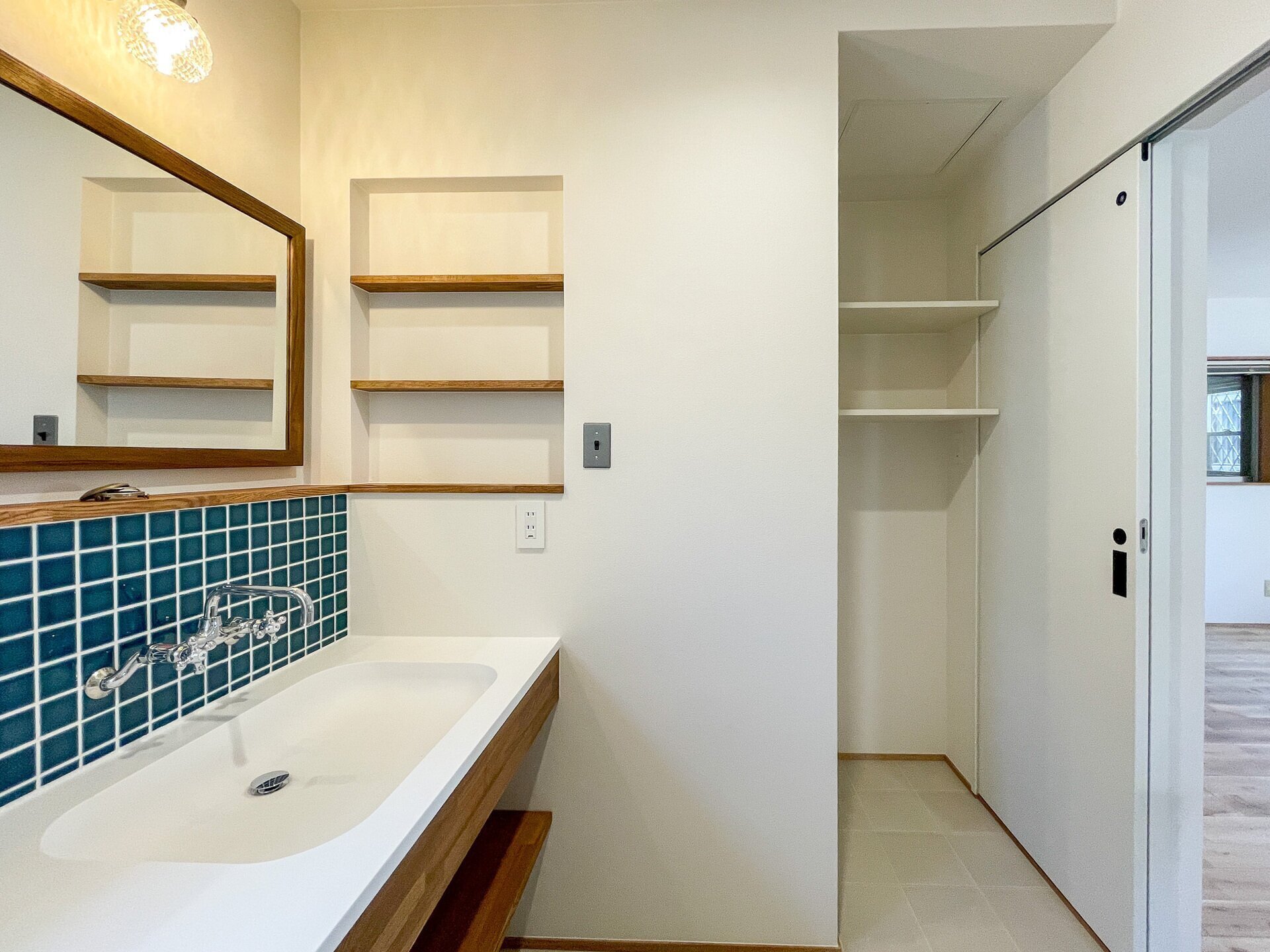 ☑︎洗面ルームには造作収納を設け、機能的で明るい印象に