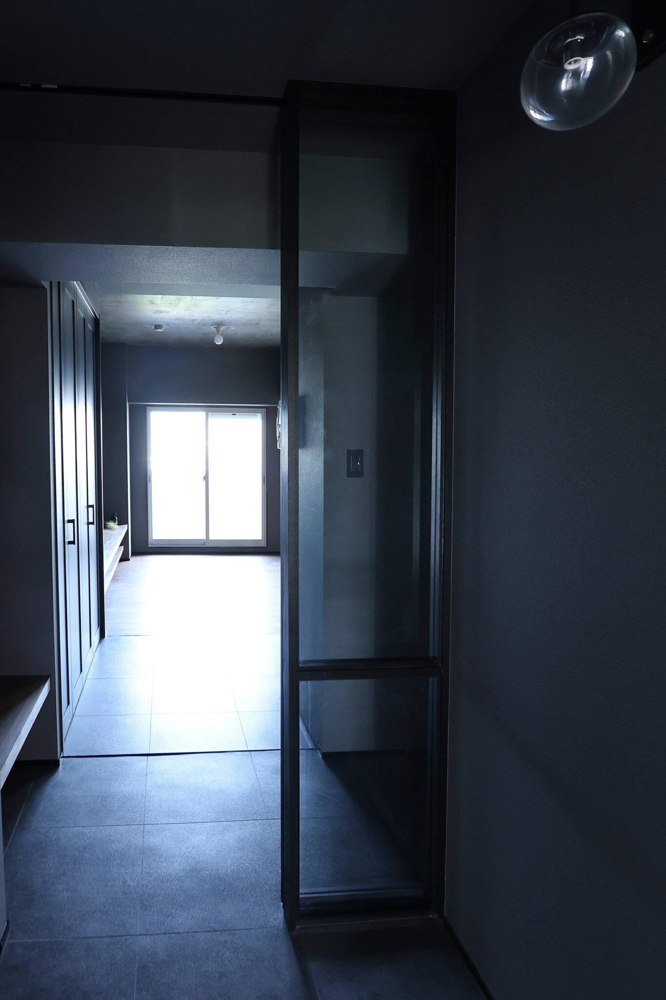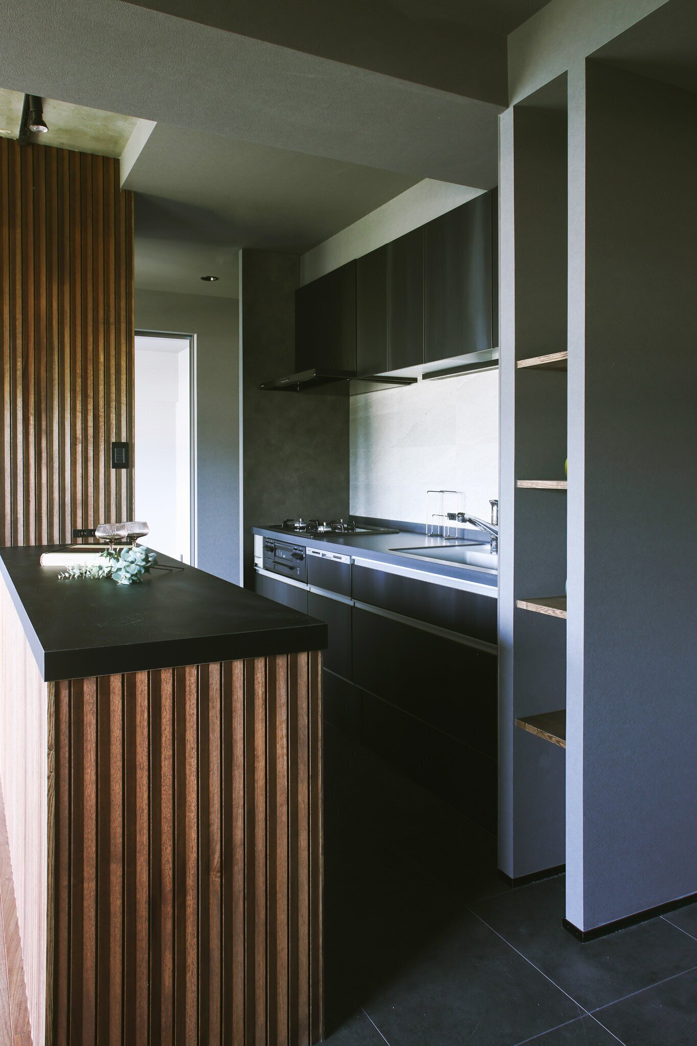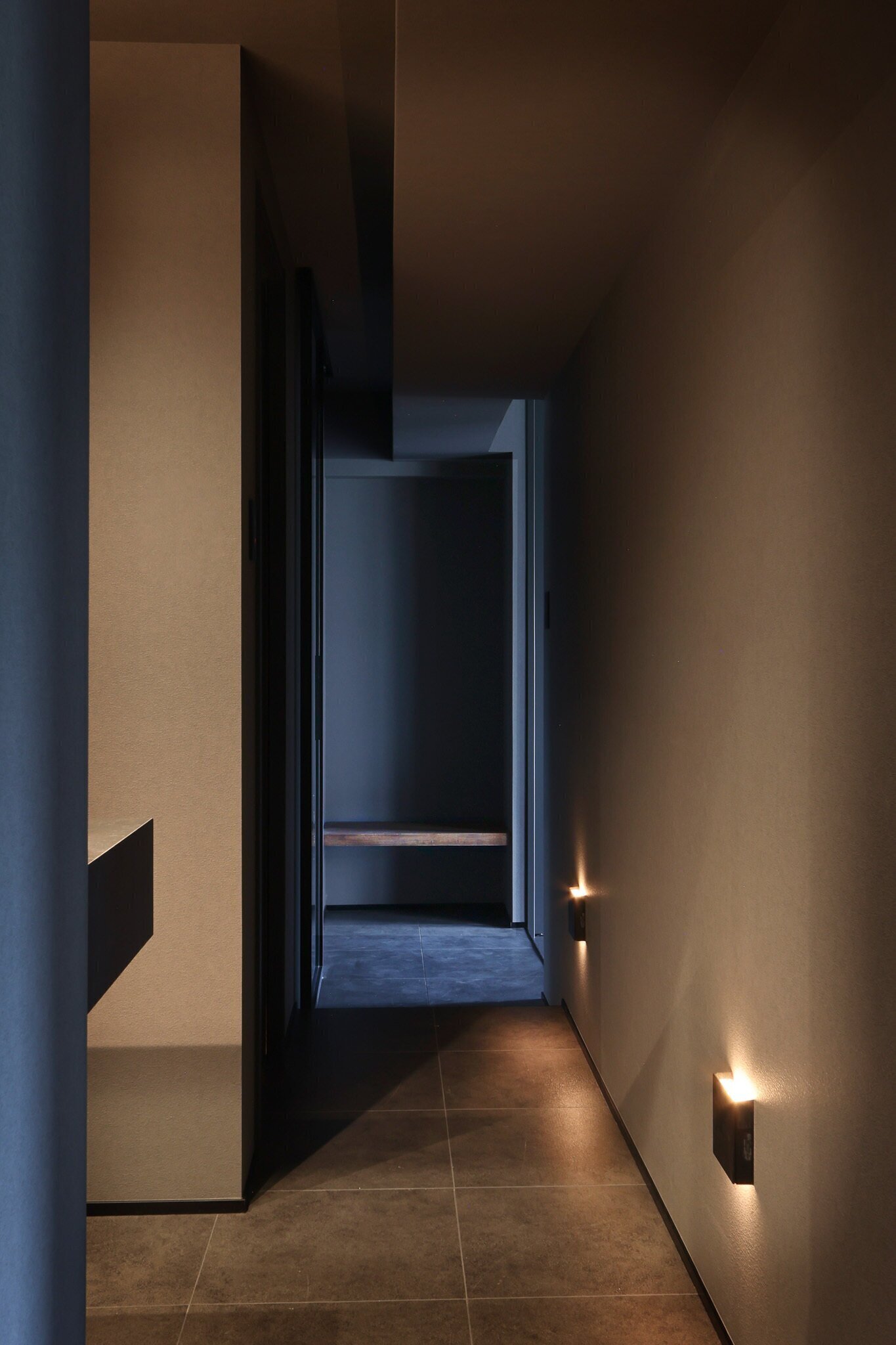 墨色の壁、マットなタイル、削ぎ落とされた光。