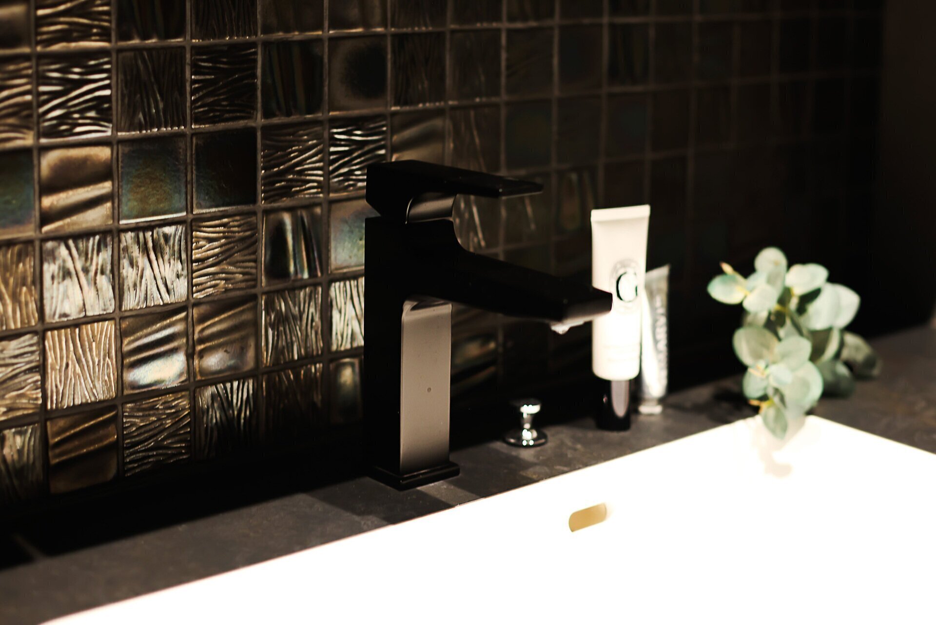 黒の水栓は、夜の静けさのような深さを映す。